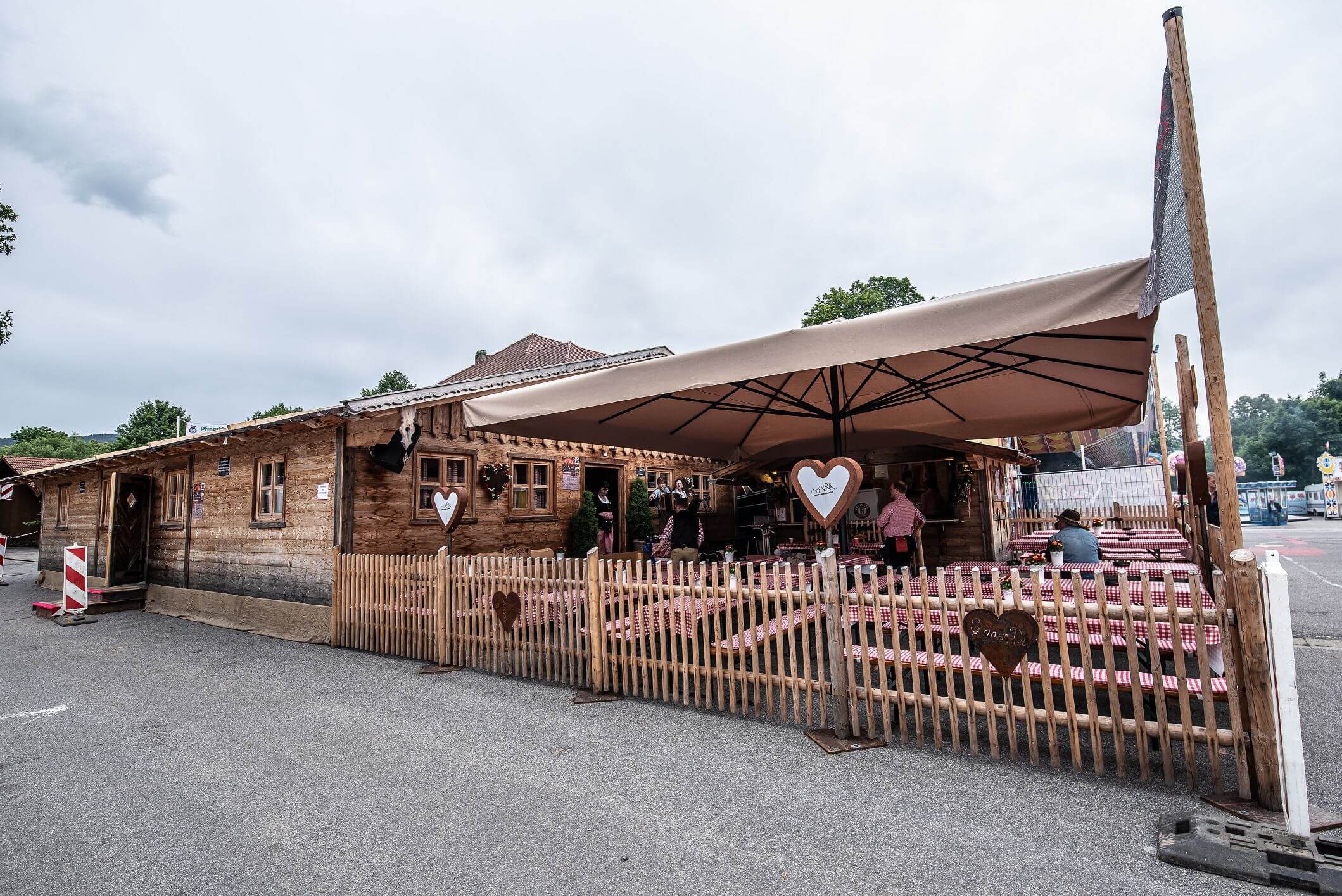 Unsere Almhütte wurde ausschließlich mit Massivholz erbaut. Treten Sie ein und fühlen Sie sich wie auf einer Alm in den Bergen. Die Hütte hat eine Grundgröße von 10 x 15 Metern. Die Hütte ist eingerichtet mit Massivholzmöbeln, einer Theke und massiven Holzstehfässern. Auf Wunsch verfügt die mobile Almhütte über einen Biergarten in verschiedenen Größen, dabei bieten große Sonnenschirme mit 7 x 7 m und 5 x 5 m bei sonnigen Tagen den idealen Schatten. Die Hütte bietet Platz für rund 200 Gäste.